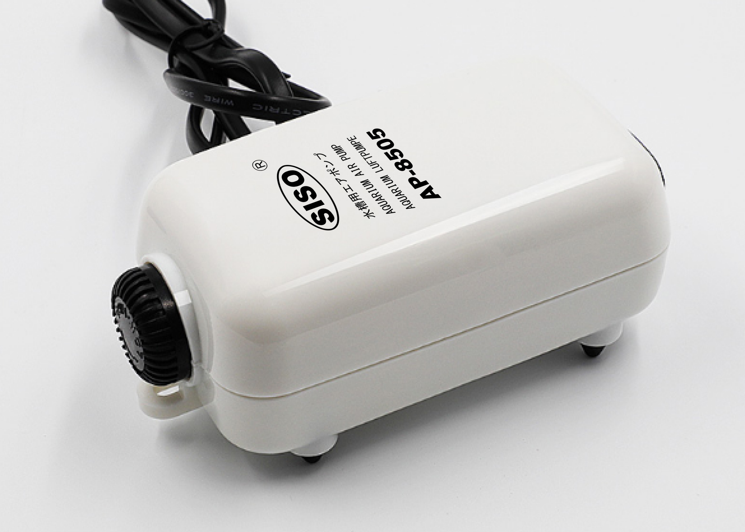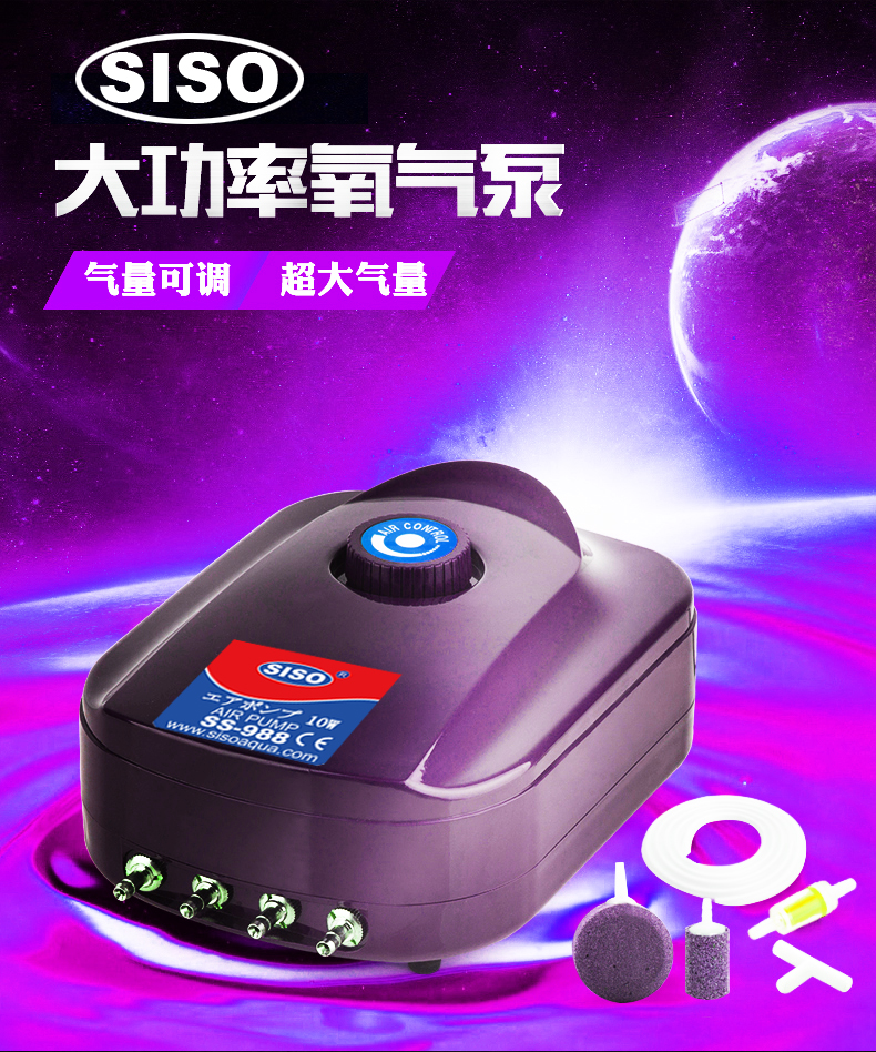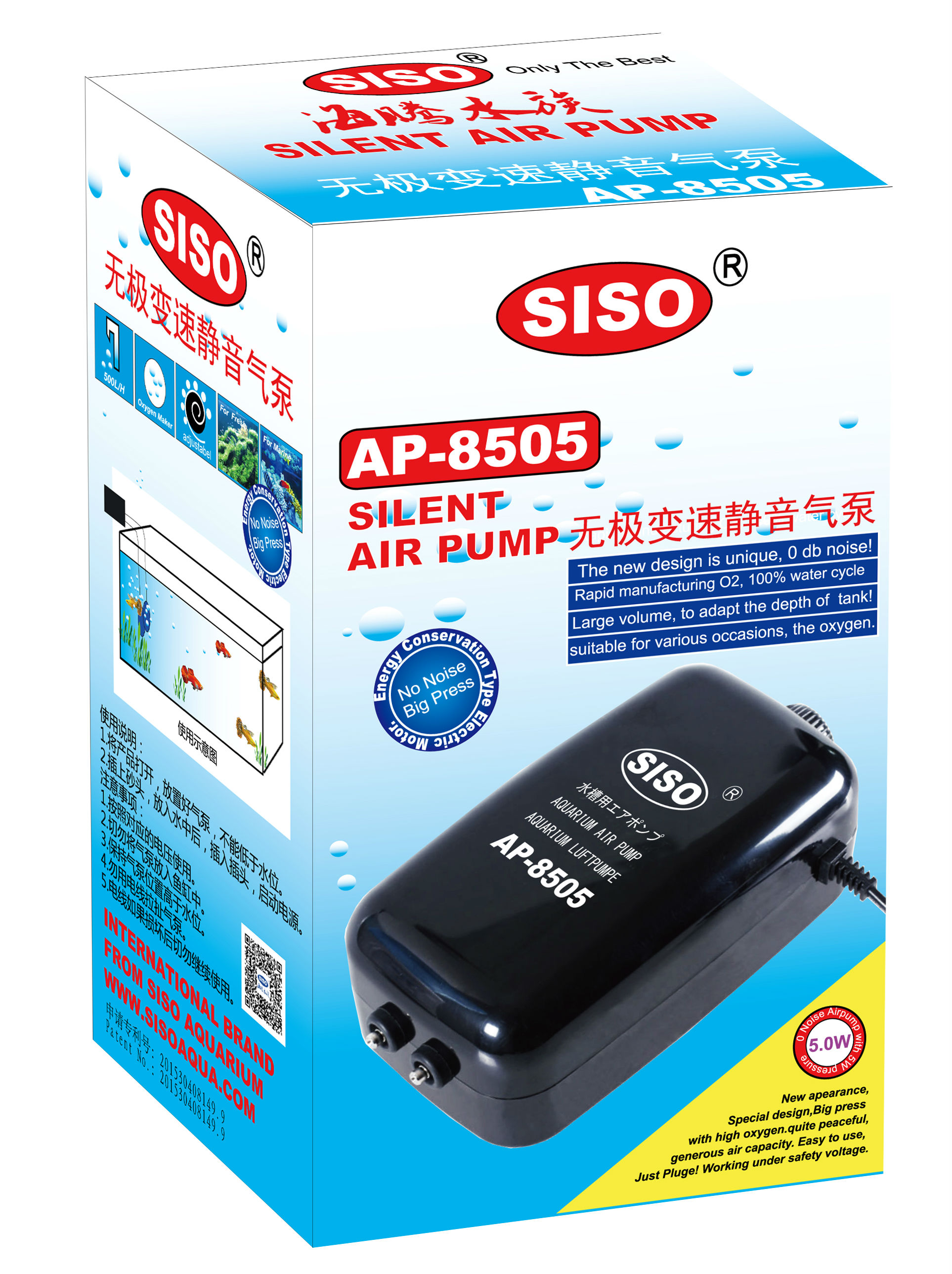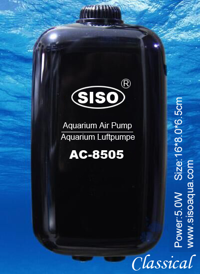 | 强力静音可调节静音气泵AP-8505 *采用无极变速气调节气流大小,您需要任何气量都可以满足。 拥有先进的空气压缩系统和减震系统,多级消声设计,噪音极低 *采用特种合成橡胶组件,气量、压力恒定。 *结构合理紧凑,以最低功耗获得最佳效果,经济省电,使用寿命长。 *using the Micro Modifier outlet any volume you need. *The product possess advanced air-compressing system, dampingsystem and multilevel muffler which is extremely low in noise. *Adopt special artificial rubber to keep steady air output and pressure. *The structure is reasonable and compact,it is long service life and acquiring best effect with lowest power consumption. NEW ADJUSTABLE AIR PUMP FROM 0 to 500L/H ; Pump size:160*80*65mm Power:5.0W